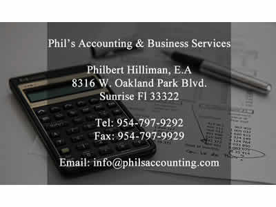 Phils Accounting & Business Services To provide the highest quality of professional accounting and Tax services to small & medium size businesses.Provide quality service to all clients without regards to fees. Speedy response to all clients need. Every client must feel comfortable at the end of every accounting or tax preparation. Individual and Corporate Taxes, Financial Planning, Non-Profit 501c3, Bookkeeping/Accounting and Payroll Service.